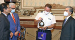Fregattenkapitän Tilo Kalski und seine Besatzungsmitglieder überreichten zusammen mit dem deutschen Botschafter Dr. Guido Hildner in der deutschen Botschaft einen Bocksbeutel als Gastgeschenk an vietnamesische Regierungsvertreter.